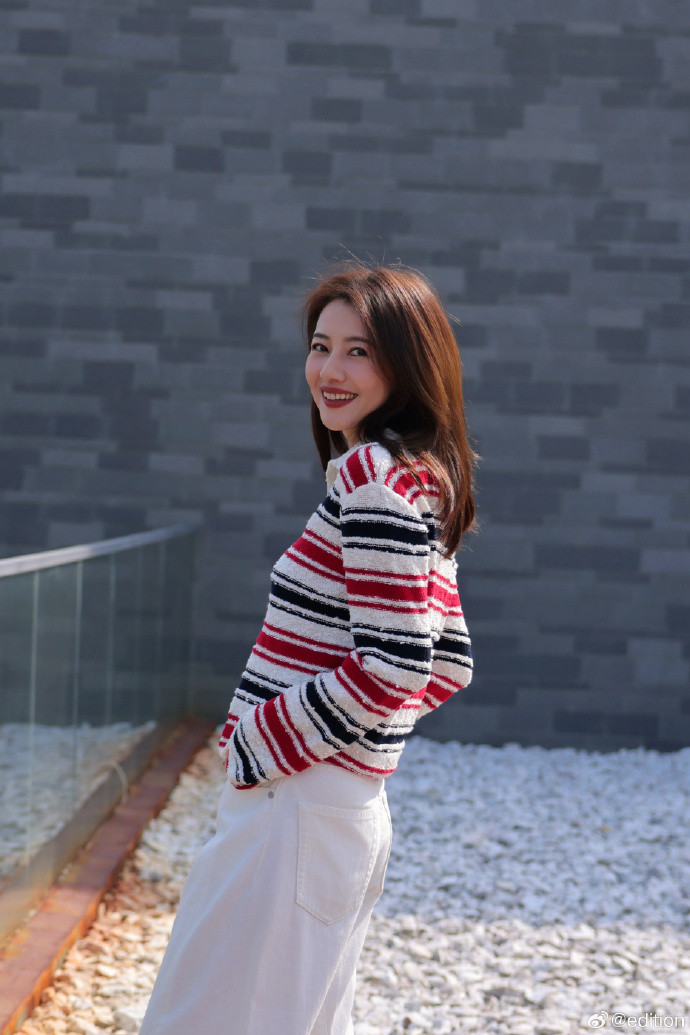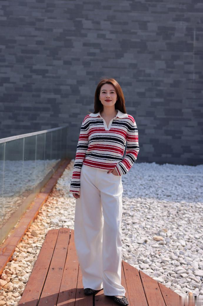 高圆圆身穿edition 2026春季E+轻生活系列毛织上衣及阔身牛仔裤,翻领开襟简约松弛,红黑织纹以清新过度,搭编织皮镂空平底鞋,融入一缕暖光,轻盈踏春。