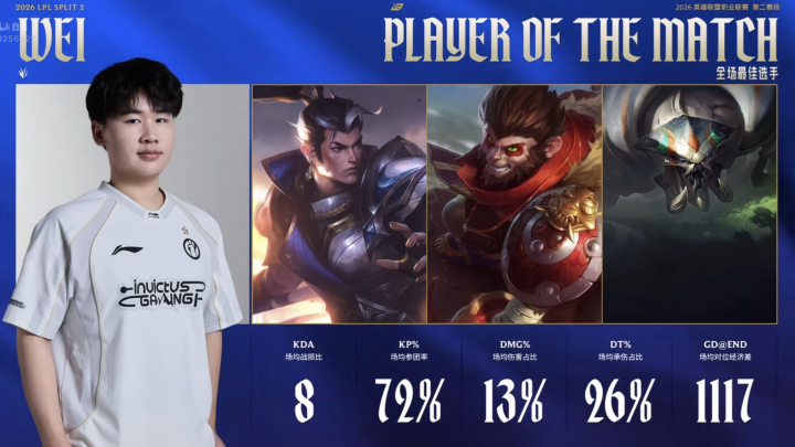 这个赛季失去了rookie这个核心后,如今的这支IG反而是越来越好了,在今天对阵NIP的比赛中,虽然第二局被对手耍了个小巧思成功偷家,但硬实力层面还是比NIP更强一些,最终也是2-1拿下比赛胜利,wei也是斩获了整个系列赛的最佳选手。