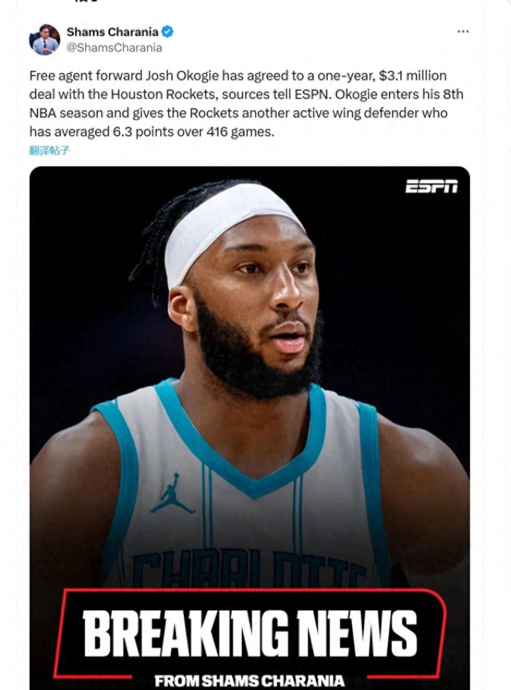本以为火箭补强已经结束了,但没想到他们依然在用自己仅剩的空间去补强。根据名记Shams的消息,火箭用一份310万底薪签下了前太阳队侧翼约什-奥科吉,这也让火箭队内人数达到常规赛最低的14人的标准,毫不夸张地说这又是一名典型的乌度卡式补强。