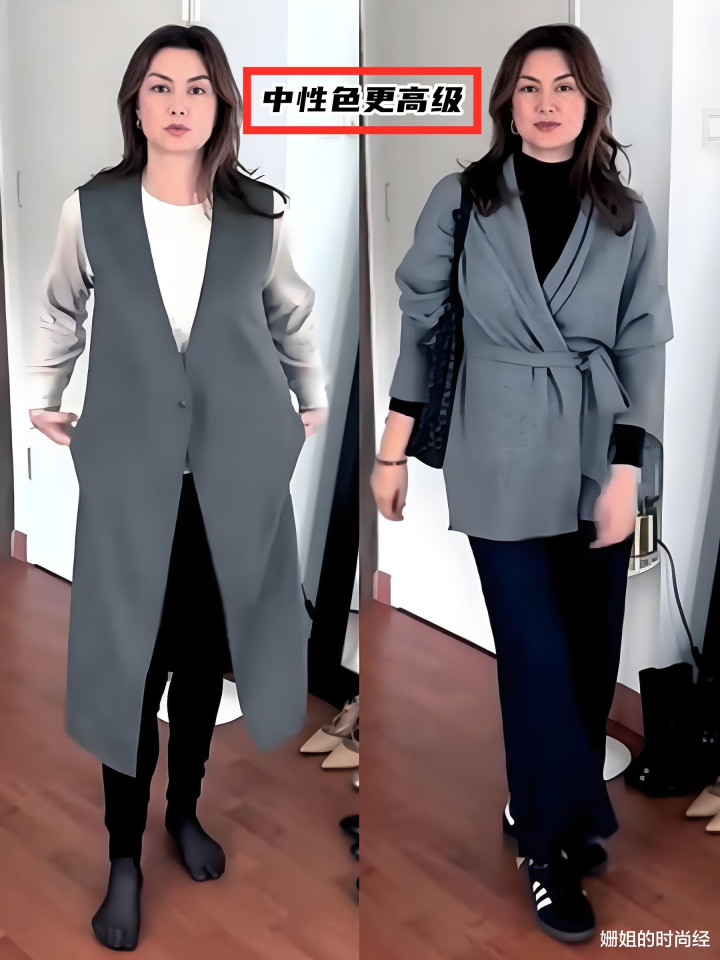 她抛弃了年轻时可能会尝试的鲜艳花哨色彩,衣橱以黑、白、灰、蓝、大地色等中性色为主。这些颜色冷静、高级,能很好地衬托出成熟女性的沉稳气质,避免廉价感。