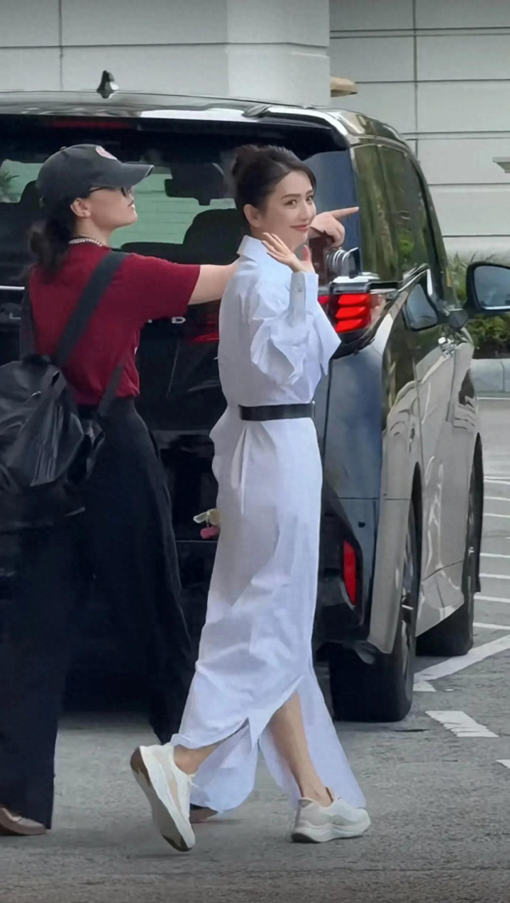 这款长款白色衬衫裙,本身就自带“百搭却不普通”的特质。利落的直线条保留了衬衫的飒爽,过膝长度又增添了裙装的温婉,恰好契合佟丽娅自带的大气气质。