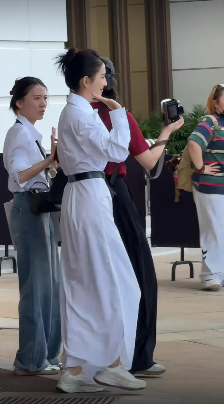 衬衫裙+白色运动鞋的搭配思路,不同于常规活动造型搭配高跟鞋的精致感,白色运动鞋的加入,为整套look注入了轻盈的活力——鞋款的简约设计与白裙色调呼应,不会显得突兀,反而中和了衬衫裙的正式感,让佟丽娅在镜头前的回眸一笑,既有温婉大气的端庄,又带着几分随性自在的灵动。