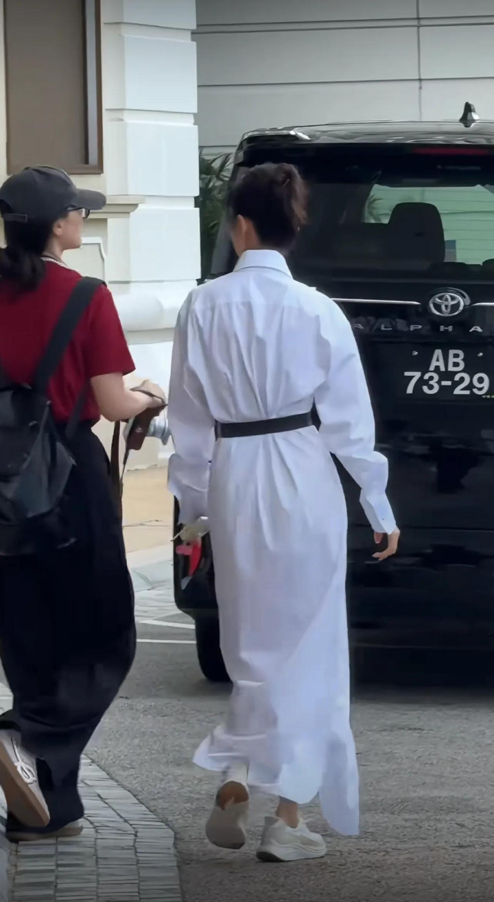 而她选择的黑色腰带,是整套造型的“点睛之笔”:窄款腰带精准卡在腰腹最细处,既打破了纯白色的单调感,又悄悄勾勒出纤细腰线,让宽松的裙装瞬间有了轮廓感!
