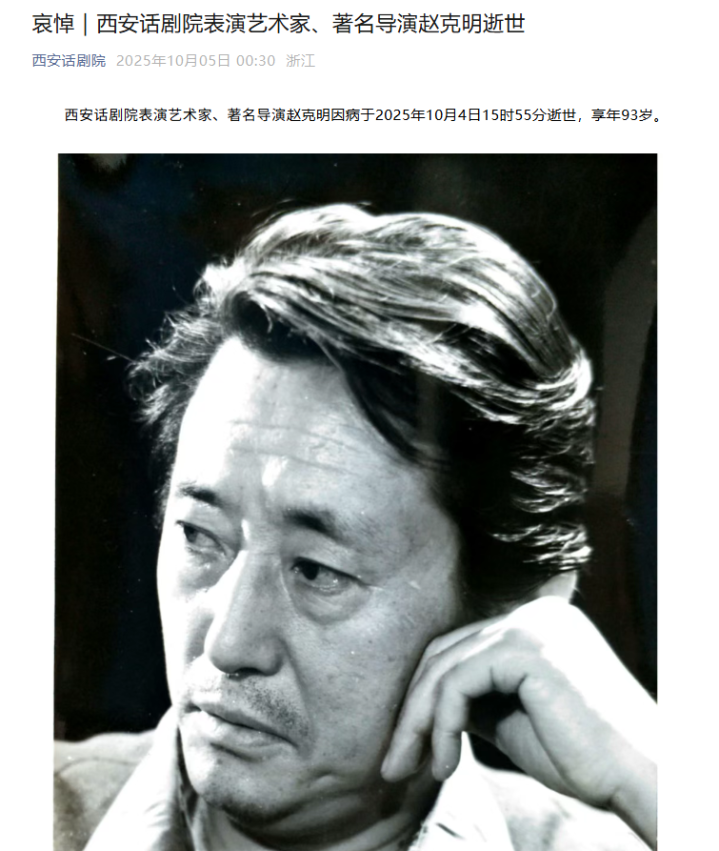 赵克明所在单位“西安话剧院”在5日凌晨发布讣告,分享赵克明在2023年接受采访的视频,当时他的精神状况很好,说话中气十足,为自己的老单位“西安话剧院”庆祝成立70周年。