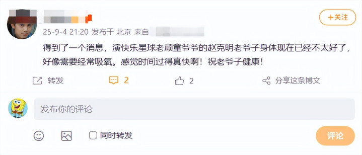9月初就有网友爆料,赵克明身体不太好了,经常需要吸氧,当时大家还不愿意相信,以为赵克明爷爷会很快康复,重新回到《快乐星球》出演。