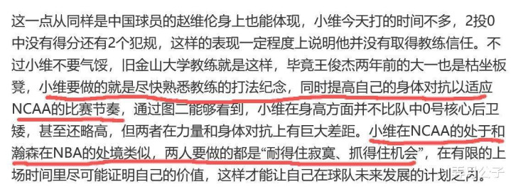 日前,旧金山大学以74比79不敌犹他州大的比赛中,虽然王俊杰表现抢眼,全场出战32分钟,拿到NCAA生涯新高的23分,但赵维伦这场比赛仅有3分钟的上场时间,2投0中,没有得分入账。