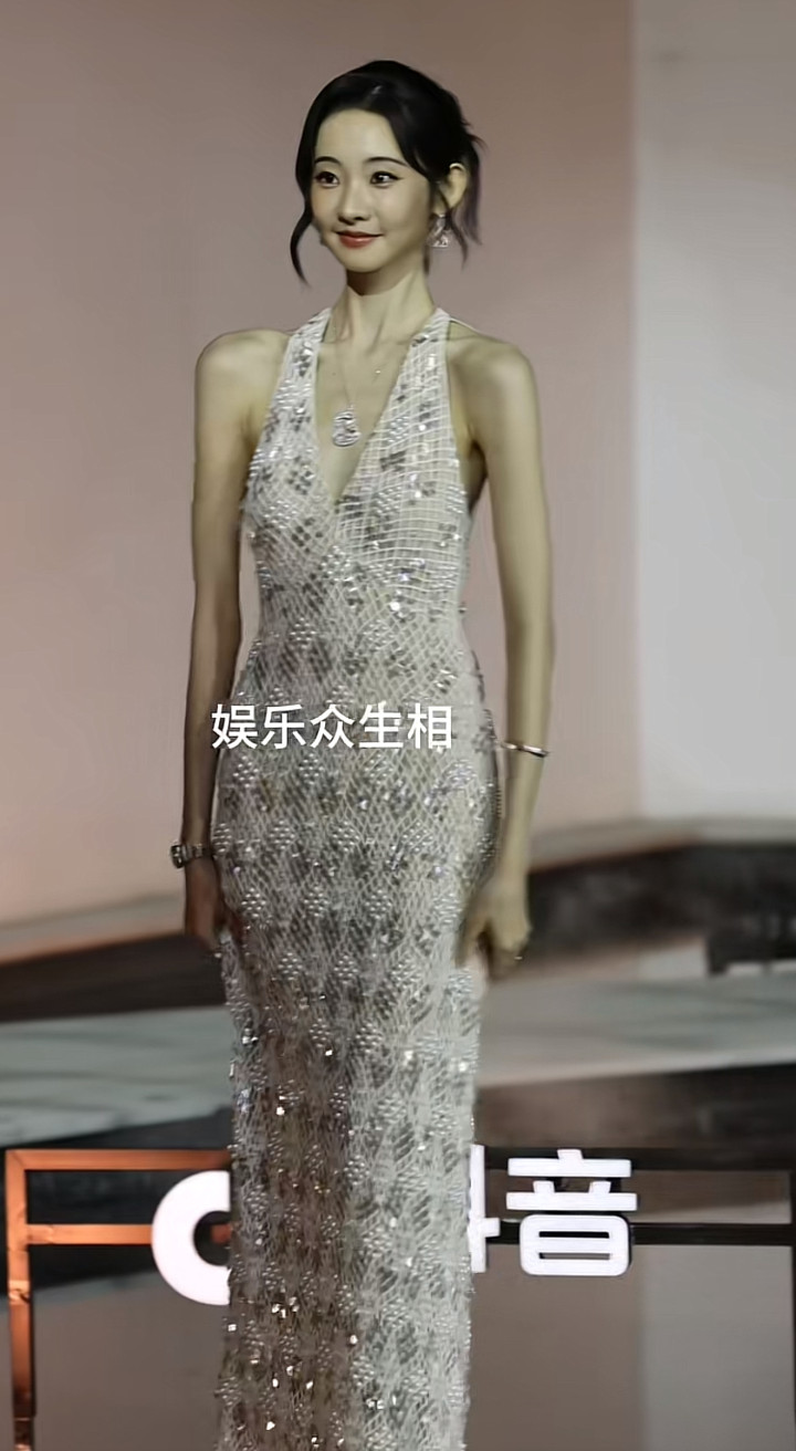 红毯上,她穿着一条blingbling的挂脖长裙,头发高高盘起,一眼看去第一印象是“好长一条人啊”。