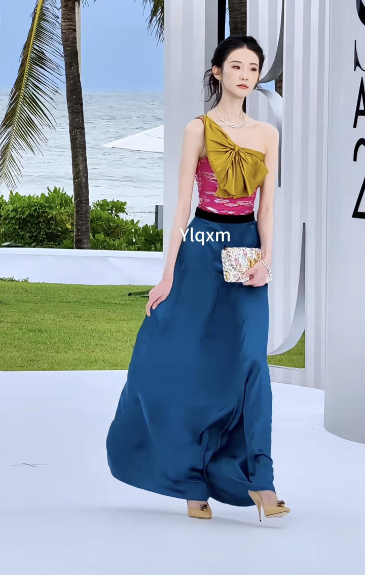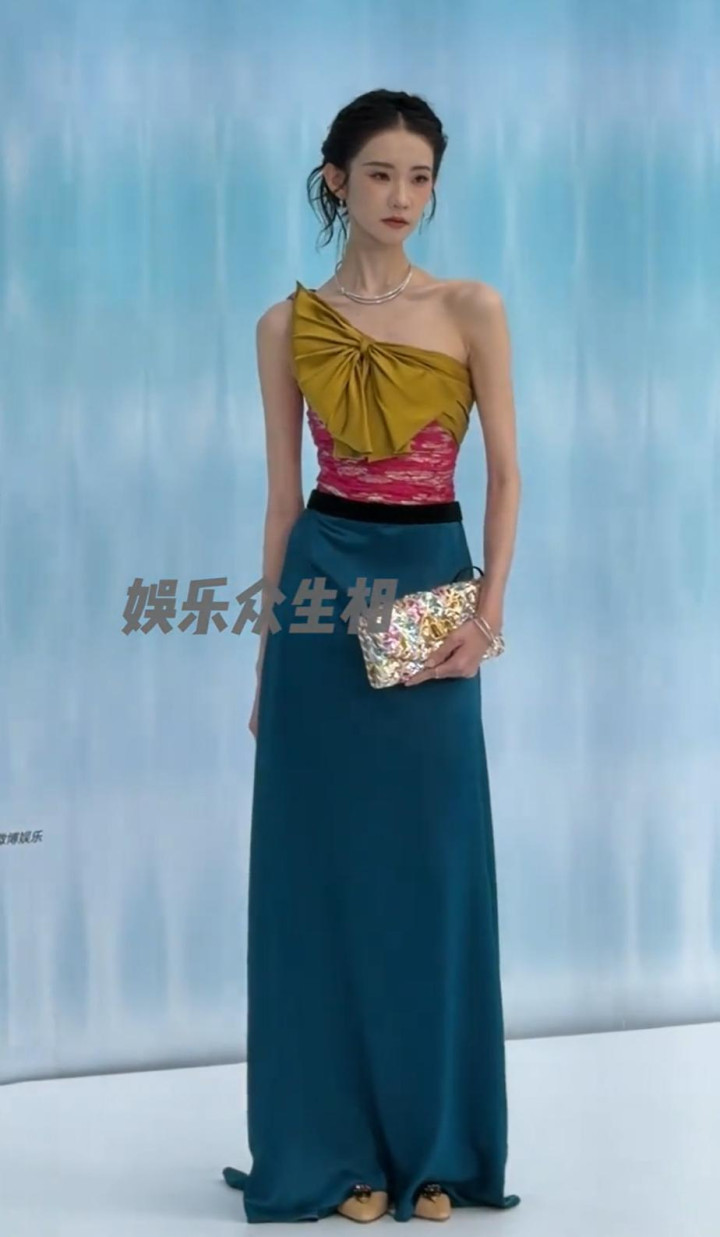 礼服讲真的,不太好看,湖蓝色的裙摆拼玫红色的抹胸,胸前还有一块黄色的皱巴蝴蝶结,但她的个子高,身材纤瘦,把六十分的衣服穿出了九十分的味道来。