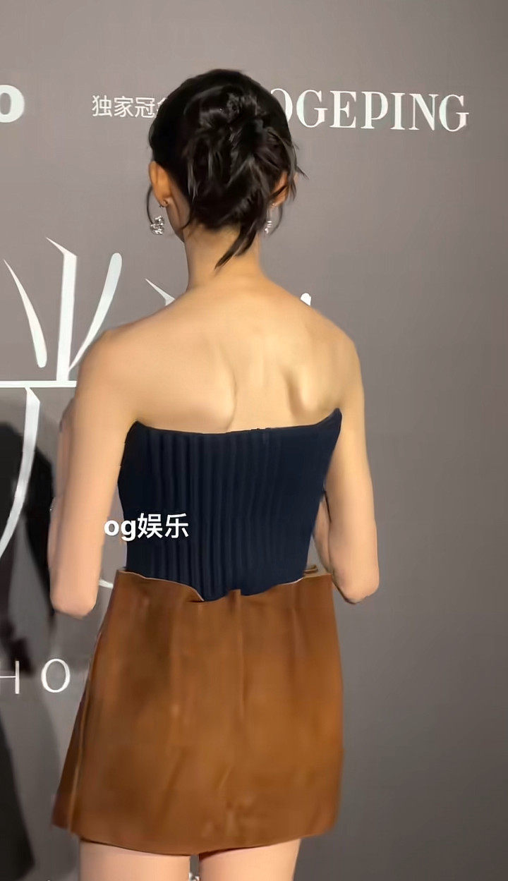 上台领奖时又是一套新的造型,黑色的针织抹胸,搭配焦糖色的短裙,穿上平底鞋都有一种直冲屏幕的挺拔。