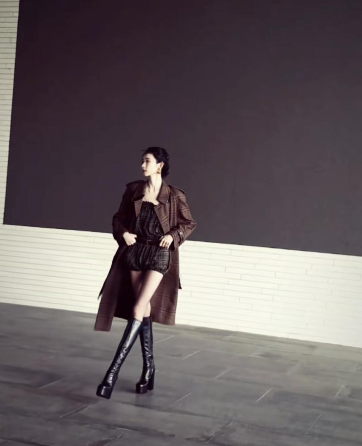 另一套则是Saint Laurent千鸟格大衣配高筒长靴,复古与现代感兼具。