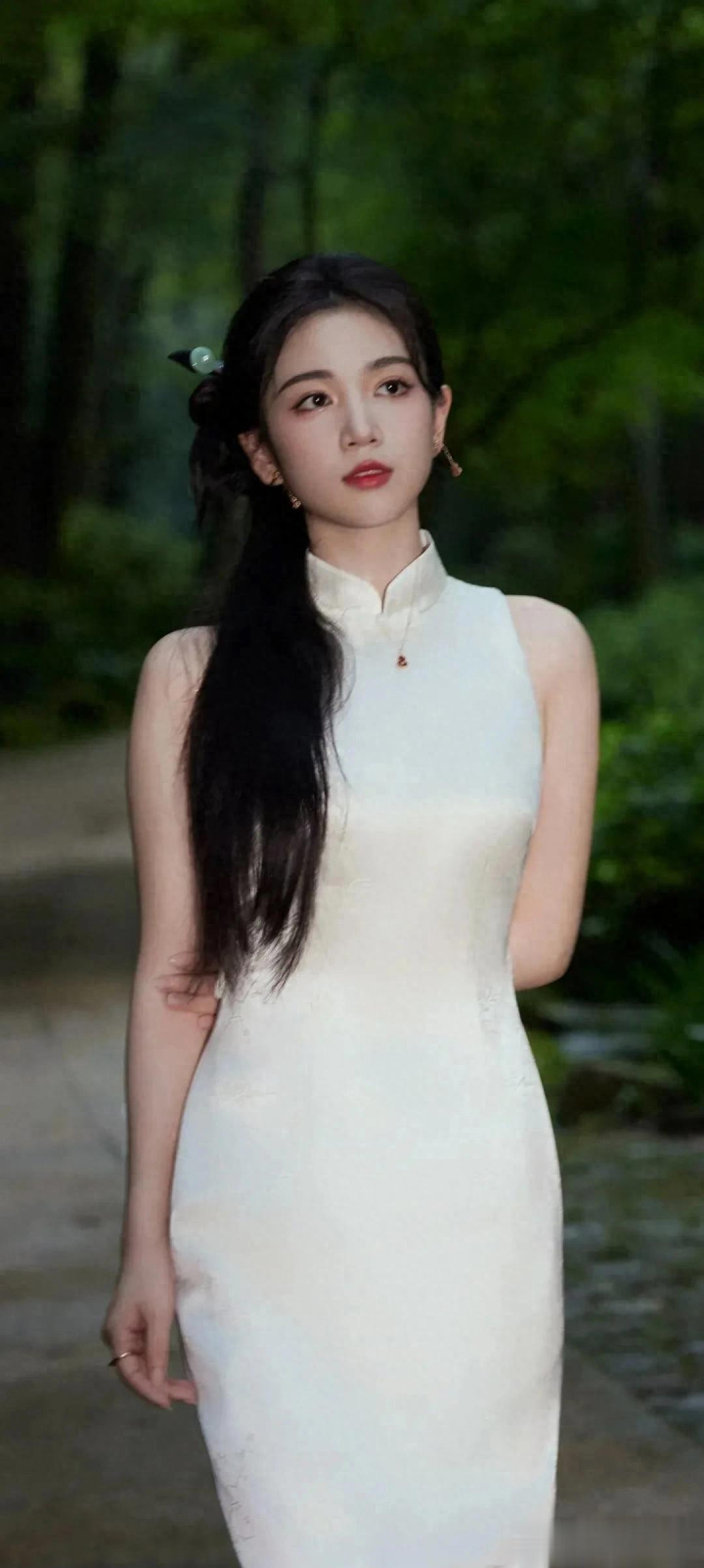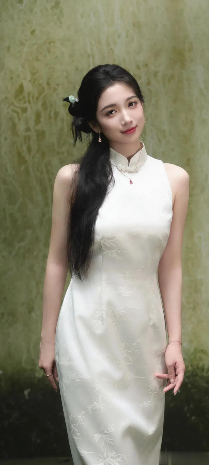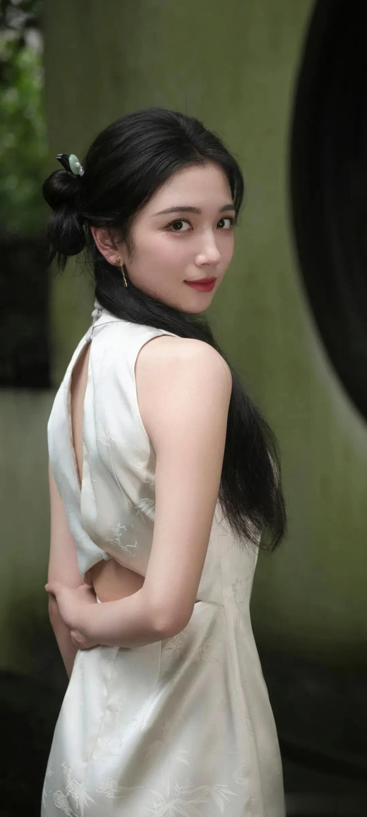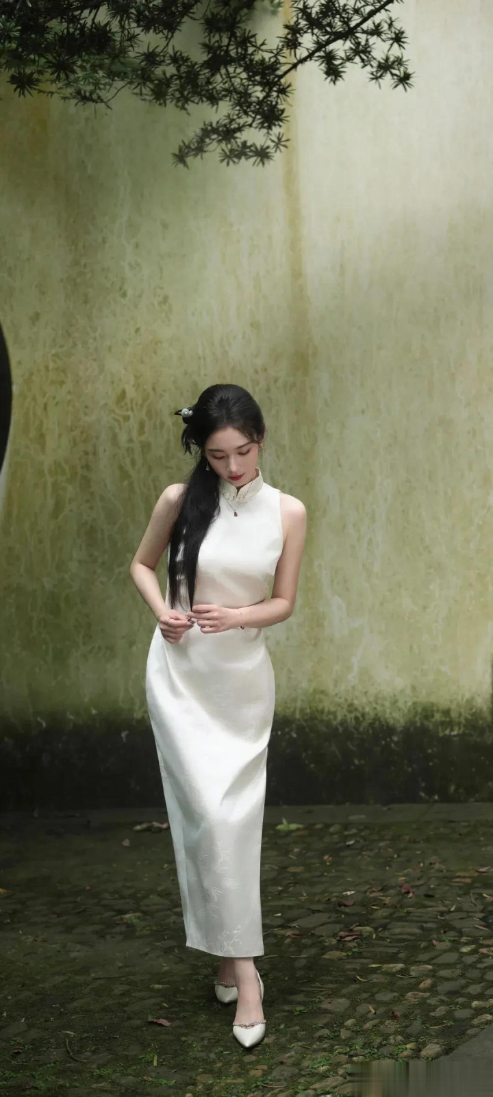 不是那种裹得紧绷绷的传统款,她穿的是改良米白缎面旗袍——暗纹竹叶像蒙了层江南雾,无袖领口刚好露出清瘦肩颈,后背那点小露肤,把温婉和灵动掐得刚好。