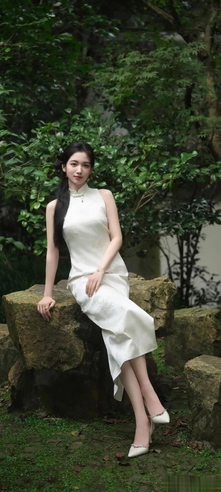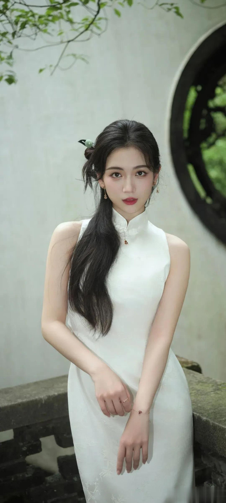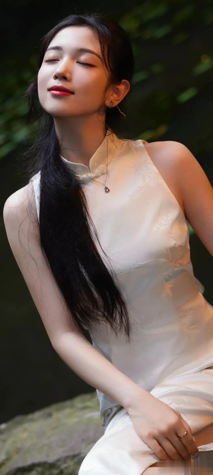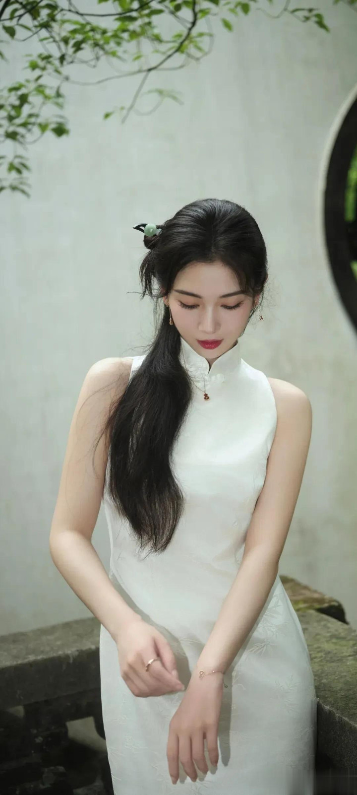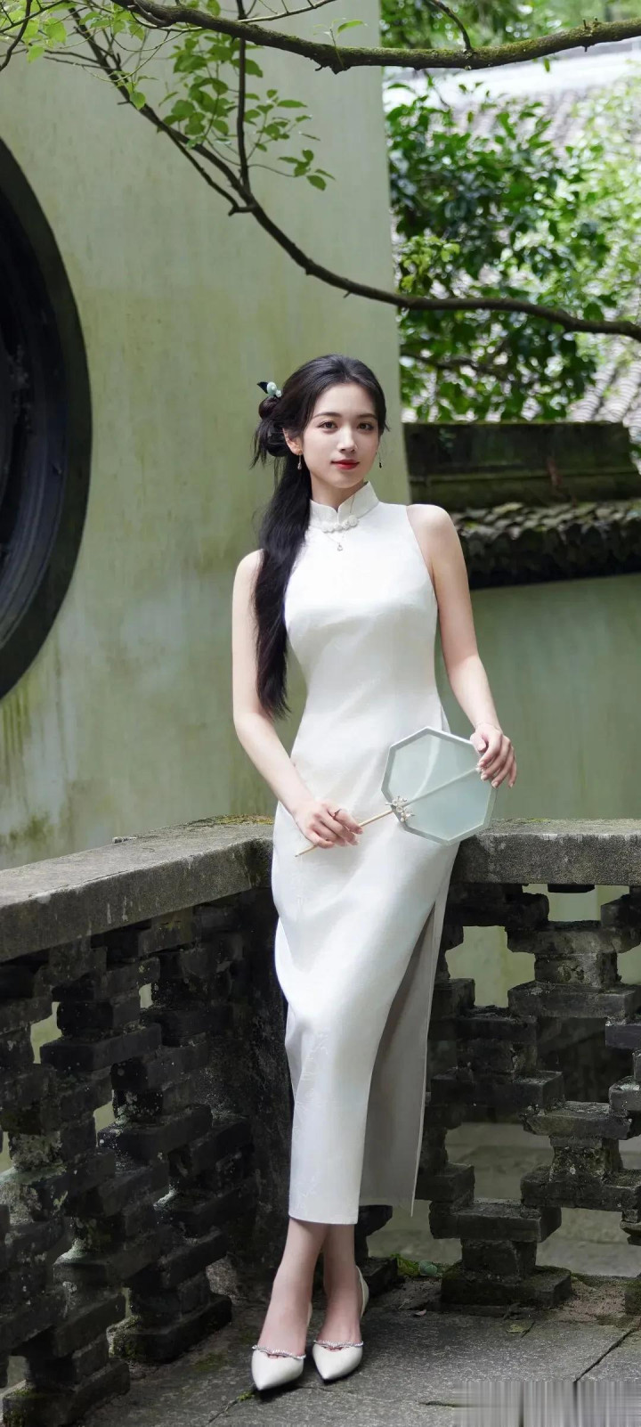 不是那种裹得紧绷绷的传统款,她穿的是改良米白缎面旗袍——暗纹竹叶像蒙了层江南雾,无袖领口刚好露出清瘦肩颈,后背那点小露肤,把温婉和灵动掐得刚好。