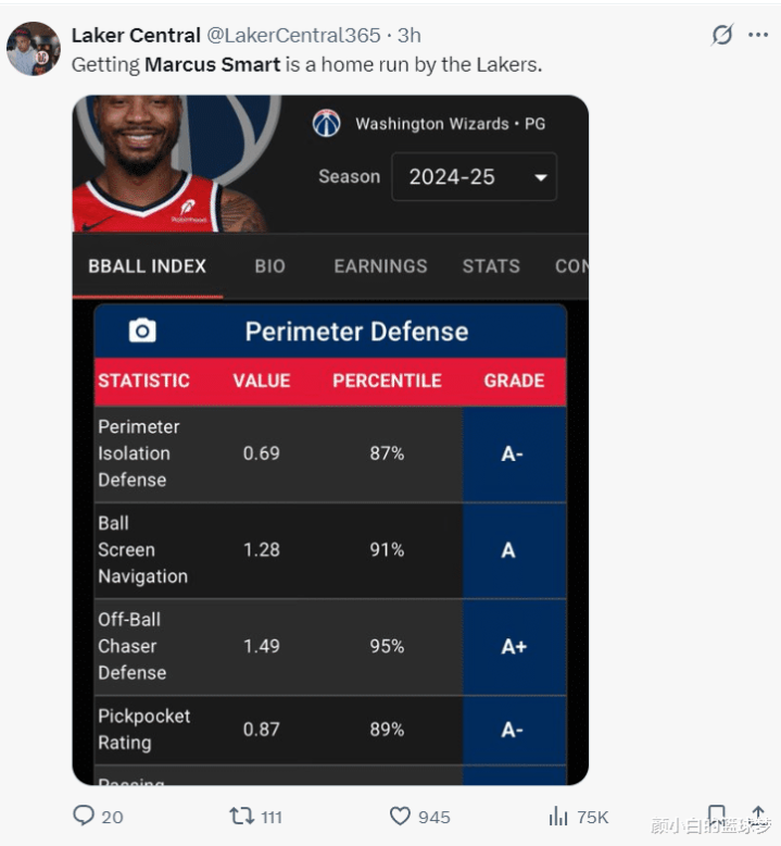 湖媒晒出斯玛特的2K防守数据盛赞他依旧是联盟最顶级的外线防守者。
