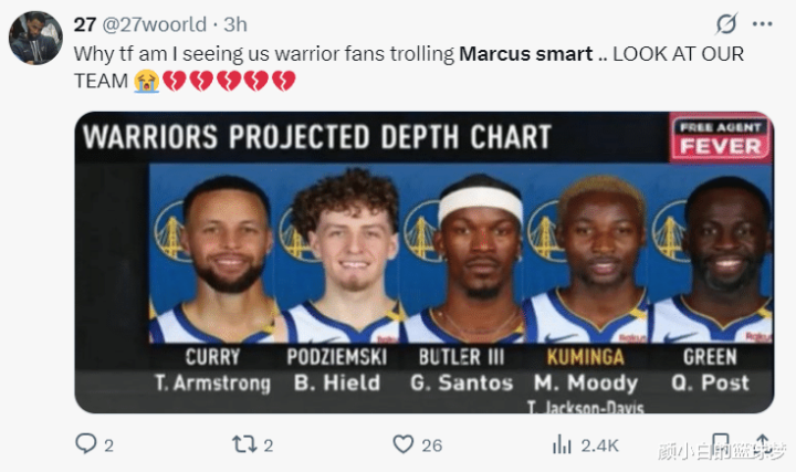 勇士球迷也被扎心:为什么我看到我们的球迷在嘲笑斯玛特的状态下滑,你们看看勇士队的阵容吧。