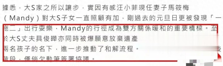 不过台媒的爆料里说的是,具俊晔之所以愿意把遗产给两个孩子,全靠马筱梅近一年在汪小菲和S家中间做沟通的桥梁。