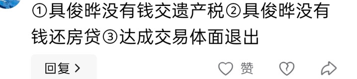 还有的网友觉得具俊晔现在之所以放弃继承大S的遗产,一是因为具俊晔没有钱缴纳遗产税,二是因为具俊晔没有钱还房贷,三是具俊晔想要最后为自己博一个只爱大S,不爱钱的深情好男人的人设。