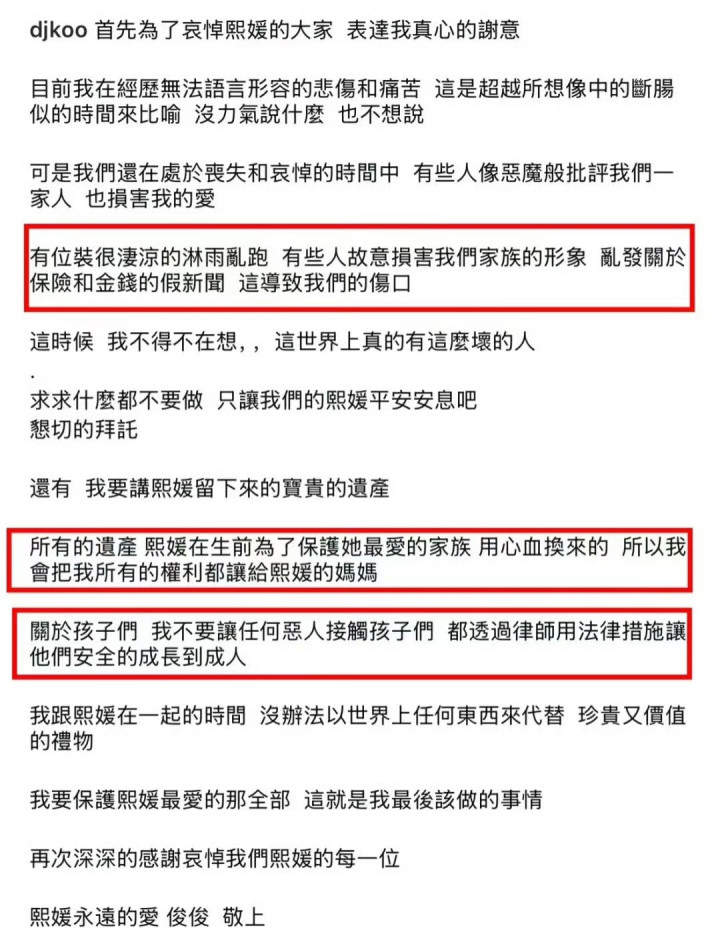 1月27日,有台媒爆料称具俊晔近期打算将自己继承的大S遗产份额全部转给大S的两个孩子,且这件事具俊晔已经和汪小菲洽谈很久了,事情到了尾声,基本上都敲定下来了,才对媒体放出风声。