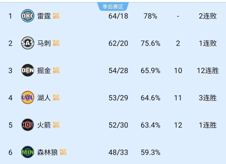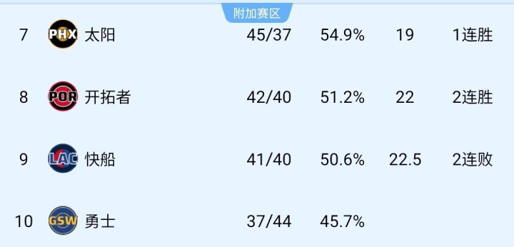附加赛排名:太阳队第7、开拓者队第8、快船队第9、勇士队第10。