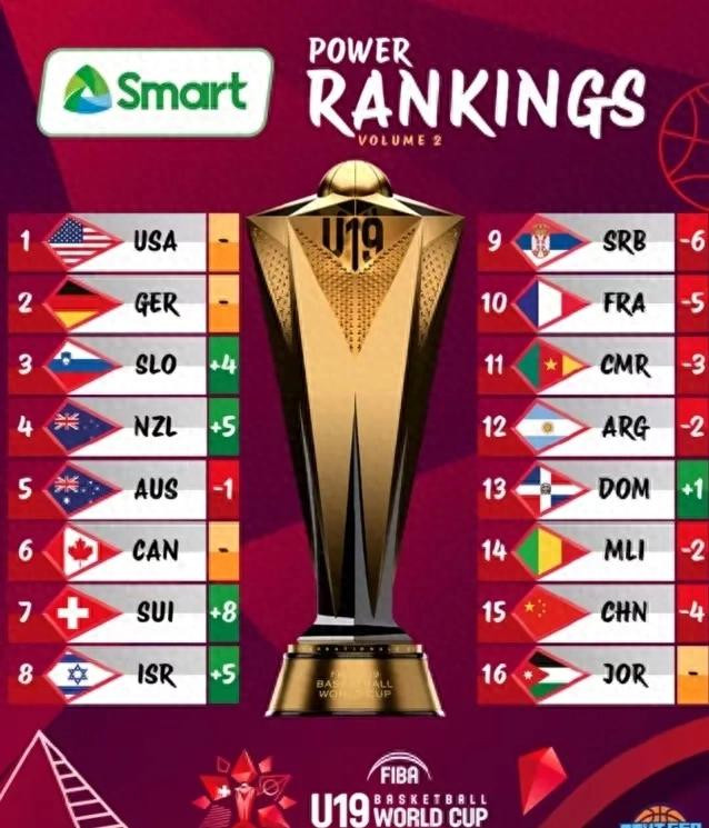 北京时间7月3日,FIBA国际篮联官方发布第二期U19男篮世界杯实力榜,中国国青队位列第15名,在16支参赛队中仅高于约旦队。此次排名较首期榜单下滑4位,实力榜榜首由美国队占据,德国、斯洛文尼亚分列二三位,新西兰、澳大利亚等传统篮球强国紧随其后。
