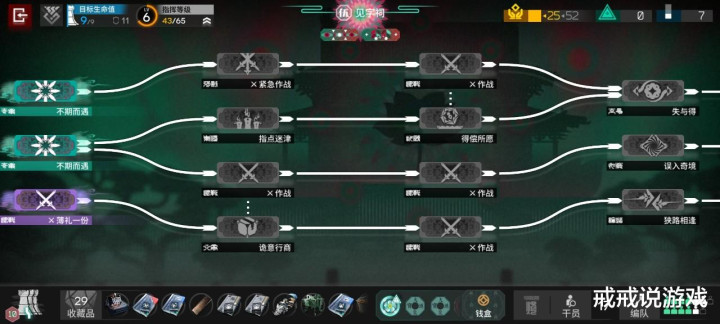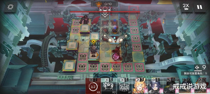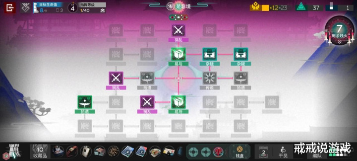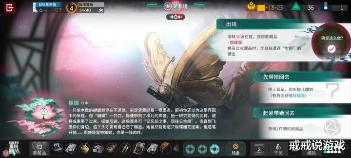 具体开二结局的方法戒戒在前面文章里也有写,就是拿隐蝶墨,然后在简单的关卡里把岁兽残躯打掉,为了避免电弧被拍死,可以放两小鱼转移锁定,这里可见电弧是真的好用。打二结局有一个方案就是多刷盾和血量上限,堆到17以上,打法推荐左路放生,对于没练度的小登来说放生更省力。
