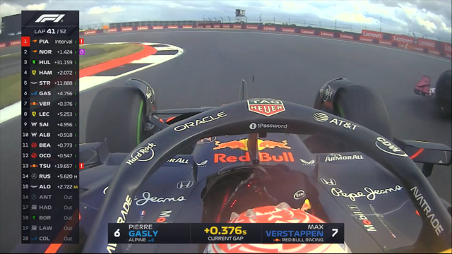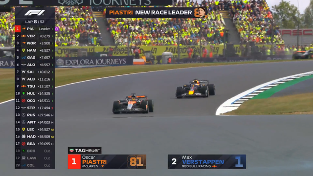 第8圈,皮亚斯特里打开DRS,超越维斯塔潘,升至第一!