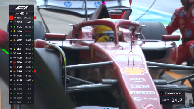 汉密尔顿无法在赛道上超越霍肯伯格,于是他在第42圈进站换上干胎,尝试undercut。