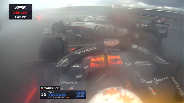 第22圈,角田裕毅与贝尔曼相撞,红牛车手因引发事故被罚时10秒。