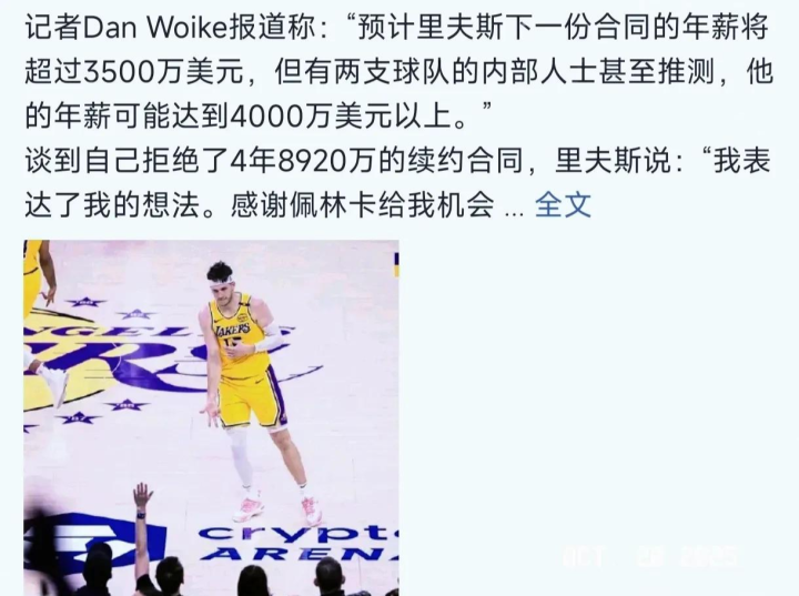 此前,湖人曾为里弗斯提供一份价值8920万美元的续约合同,却遭到他的拒绝。里弗斯称这份合同金额不太合适,但他也明确表示,自己并非追求一个天文数字。