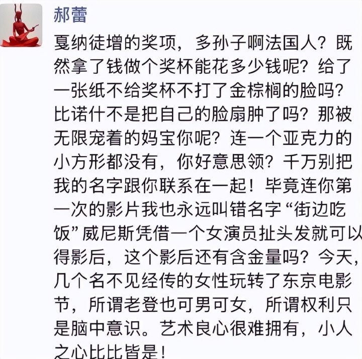 至于郝蕾爆的瓜问题就更大了,直接无差别扫射了几位大导演和知名演员,暗指现在圈内无论是要拿到什么奖,都少不了运作。